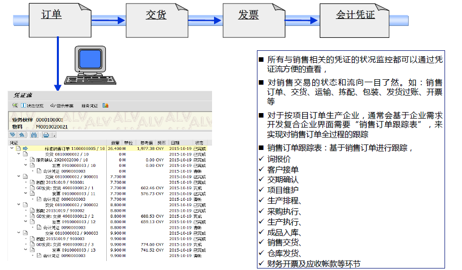 在SAP中只需要有銷售訂單,就能查詢與這個銷售訂單關聯的大部分重要業務憑證數據,做到了數據的簡便快捷查詢和業務數據的一體化。