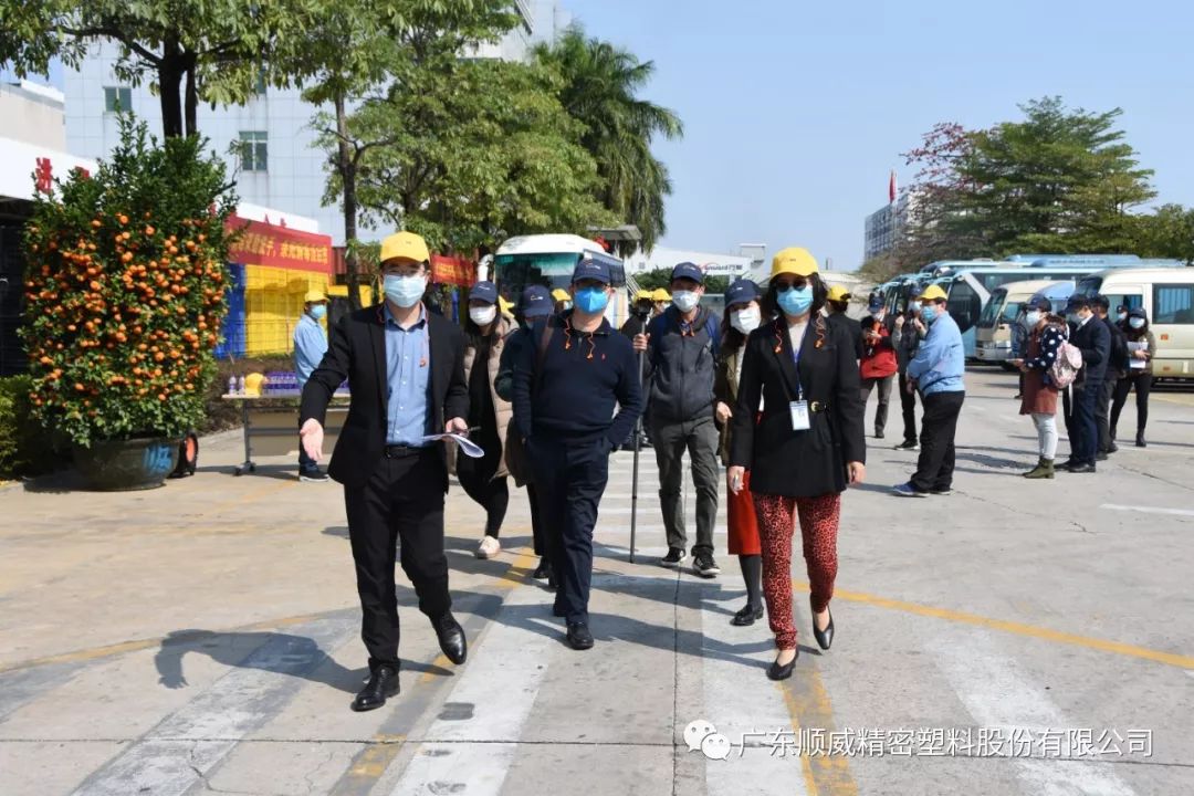 順威股份董事/總裁莫綺顏、董事/副總裁成再育、董事/副總裁/董事會秘書李笛鳴、工會主席/審計部總監童貴云、順德塑料分公司總經理范瑞強、順德模具分公司總經理龐利彬、集團戰略及商務中心/集團人力行政中心總監羅華、國內營銷中心總監助理/大客戶部高級經理王曉菲,一眾公司高管團隊在廠區廣場迎接中外媒體參觀團一行的到來。